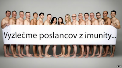 WOW - 14 pria dan 3 wanita politisi Slovakia melakukan aksi foto bugil di balik spanduk bertuliskan "Mari lucuti Imunitas anggota parlemen". Aksi ekstrim dilakukan anggota DPR partai Kebebasan dan Solidaritas berhaluan liberal sebagai protes atas berlakunya Undang-undang Slovakia yang dianggap melindungi dan mengistimewakan anggota legislatifnya.